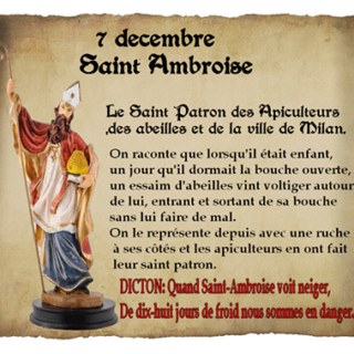 En ce jour de la Saint-Ambroise, Patron des apiculteurs, nous souhaitons à tous une joyeuse fête et une prospère année apicole. La légende de Saint-Ambroise. Ambroise enfant s’était endormi dans son berceau. Un essaim...